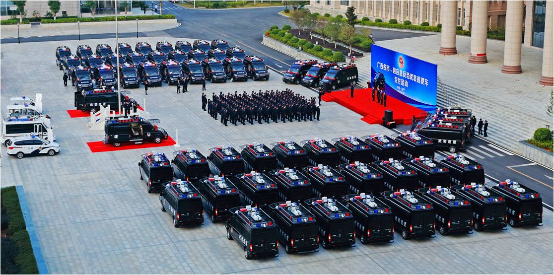 這批反恐武裝巡邏車是公司根據(jù)廣西全區(qū)反恐實戰(zhàn)需求和區(qū)域特點,研發(fā)生產(chǎn)的全新一代五菱V80特種專用警務(wù)產(chǎn)品。每輛應(yīng)急反恐武裝巡邏車能滿足5-6個警員攜帶裝備執(zhí)行出警和應(yīng)急處突任務(wù),整車安裝有防護網(wǎng),前撞擊桿,后防護桿,可清除一般性障礙,撞擊作案車輛,具有強悍的防暴制暴和突擊能力及穩(wěn)固的自我防護能力等特點。同時,該車還配備有全方位星光級夜視車載智能監(jiān)控系統(tǒng)、升降式強光照明燈、公安網(wǎng)移動上網(wǎng)本及多形態(tài)電源供給系統(tǒng),可與各級公安監(jiān)控指揮中心實時聯(lián)絡(luò),即使在極端惡劣條件下,均可啟動全方位監(jiān)控及語音通訊功能,通過